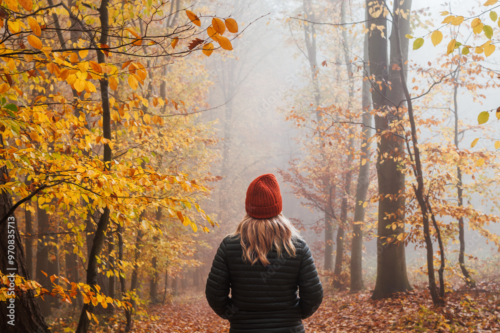 Woman with jacket and knitted hat enjoying walk in autumn forest in fog. Digital detox and harmony with fall nature