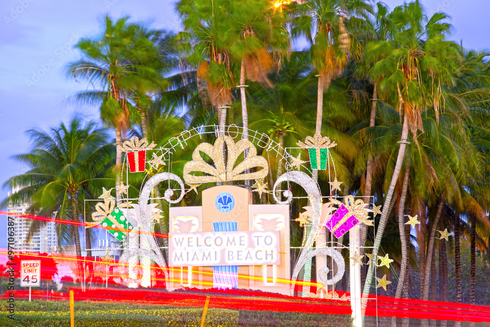 Miami Beach Welcome sign in Christmas holiday decorations and palm trees at sunset with moving traffic