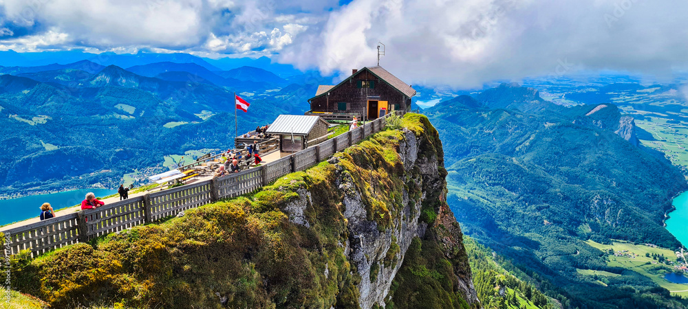 The Himmelspforte at Schafberg in Austria offers breathtaking panoramic views of the Austrian Alps and surrounding lakes. Perched on a cliffside, this iconic destination is a favorite for hikers and v