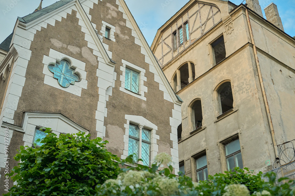 A vibrant scene unfolds in Riga's Old Town, where a colorful array of buildings stands side by side. The eclectic mix of architectural styles, combined with the vibrant colors and unique details, crea