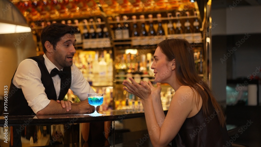 Sitting in smiling beautiful woman guest lively taking with smart bartender while drinking mixed vodka in blue hawaii cocktail and whiskey at luxurious counter bar on Friday meeting at club. Vinosity.