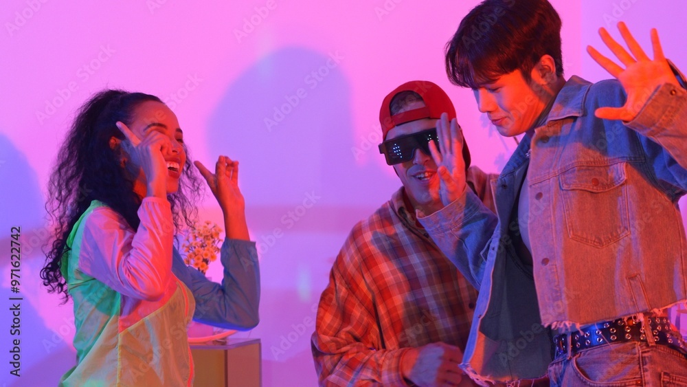 Close up of break dancer team dancing together at modern studio with pink led light. Multicultural people moving to hip hop music while wearing stylish fashion cloth. Crazy, funny mood. Regalement.