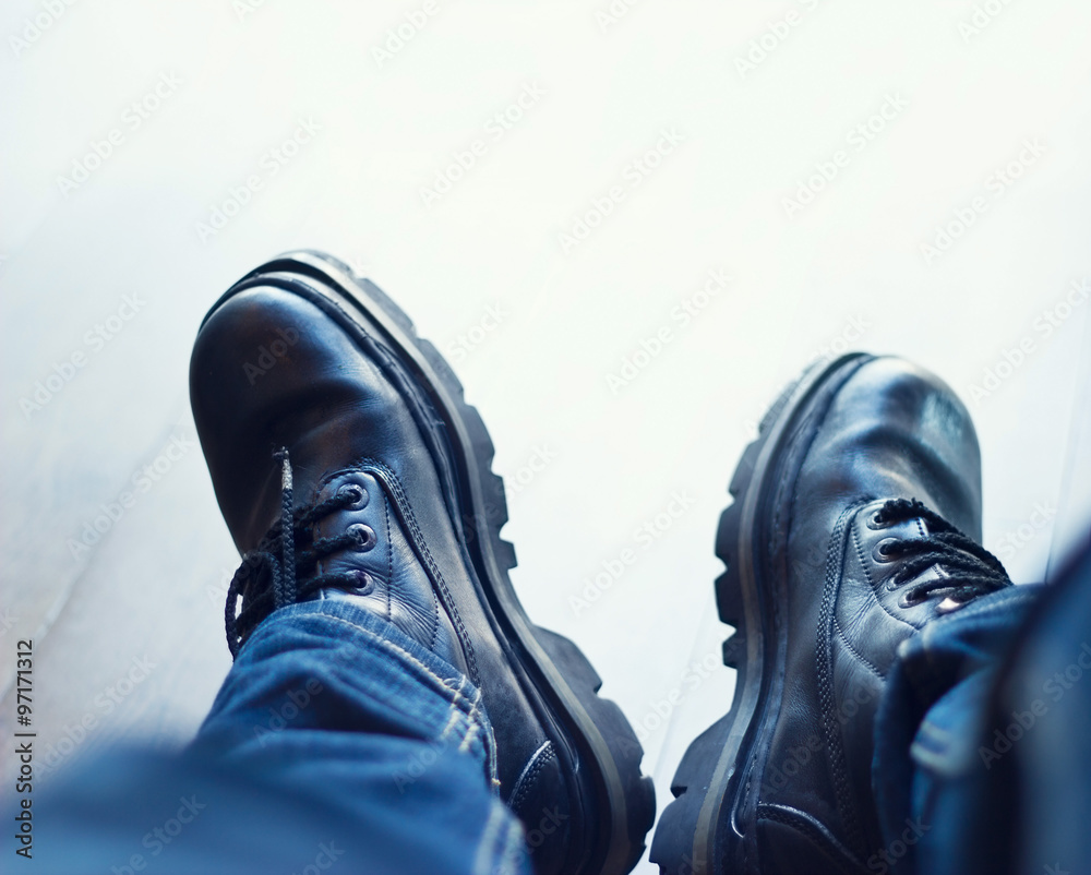 black leather men's boot on wooden floor background, Blank text