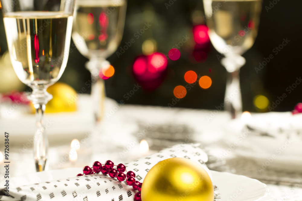 Christmas dinner table. Traditional Christmas decorations. Served table in a restaurant. Beautifully set table for Christmas Eve.