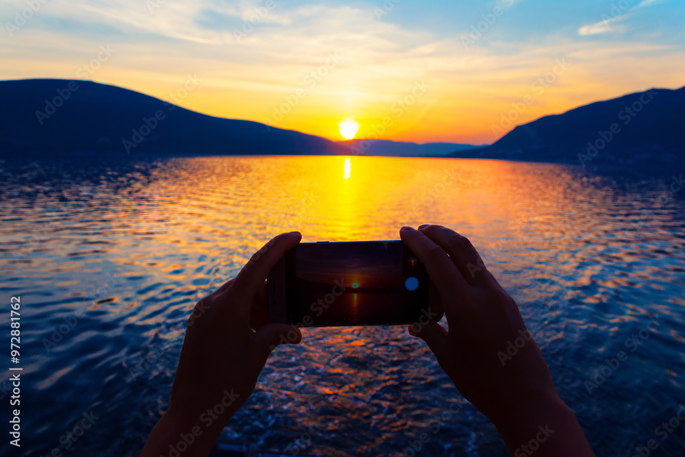 Captures of a stunning sunset with smartphone, silhouetted against the vibrant sky mountains and sea. Person is taking a picture of the sunset over a body of water