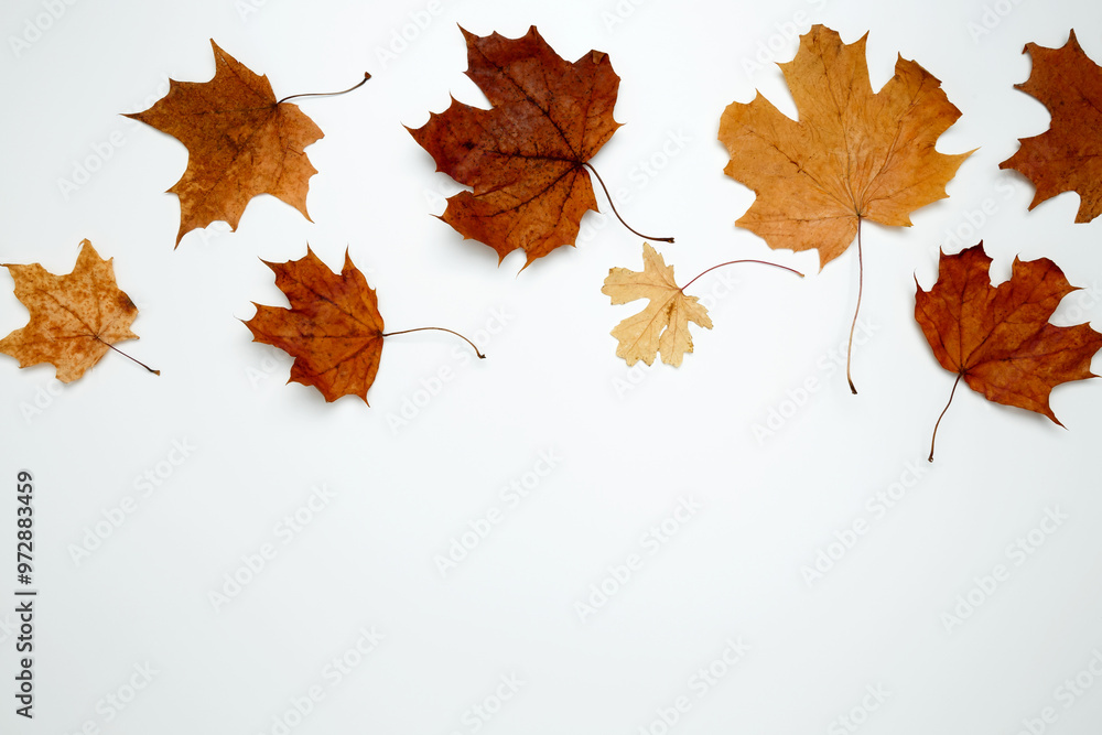 Golden orange autumn leaves of maple tree on white background. Top view. Copy space