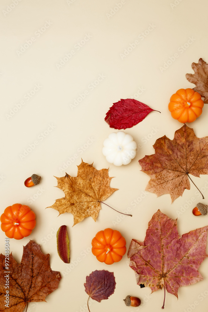 Autumn composition with maple leaves, decorative pumpkins and candles. Top view. Copy space