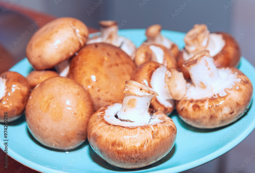 Blue plate filled with fresh mushrooms. Serving of mushrooms, emphasizing their natural colors