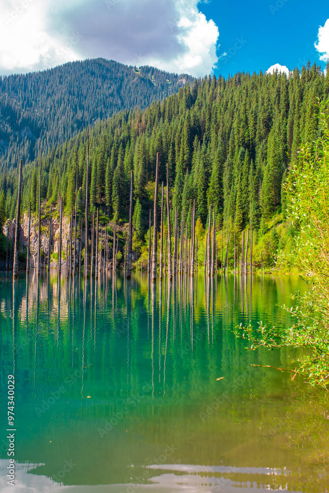 Sunken forest of Lake Kaindy in Kazakhstan. Beautiful mountain natural landscape. A blue lake with tree trunks sticking out of it. Panoramic view of the reserve.