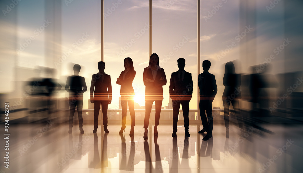 Businesspeople standing as a team in an office with sunlight shining through windows, creating silhouettes and motion blur effects.