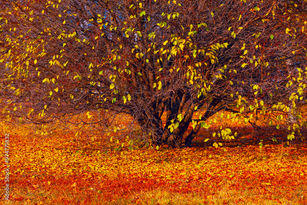 Bush with yellow leaves is in a forest. Single tree adorned with bright autumn leaves rises in the midst of a wide, grassy field