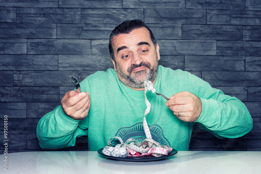 Man on diet, looking unhappy and disappointed, plate filled with measuring tape instead of food, diet and eating disorder concept