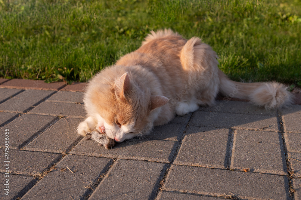 red cat caught a mouse close-up