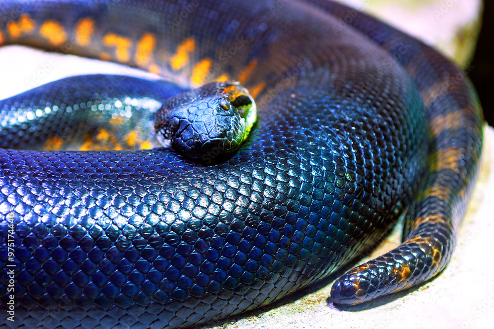 Anaconda snake is curled up on the ground. The snake is black and orange. The snake is laying on its side. Colorful snake featuring a unique blue and orange pattern