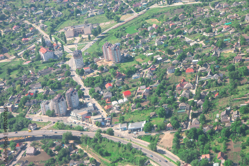 Aerial view of a cityscape showcasing buildings and streets. City view from above with a lot of houses and a highway