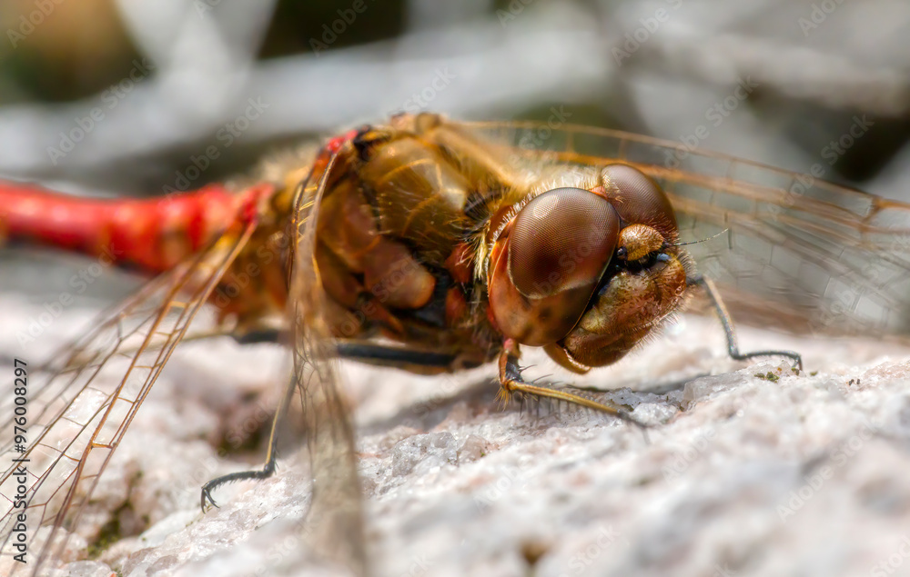 Close-Up of a Male Vagrant Darter (Sympetrum Vulgatum) Dragonfly Resting on a Rock