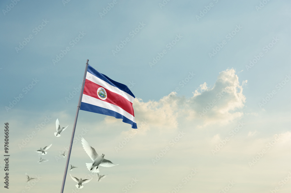 Costa Rica flag waving with flying doves in beautiful sky. Costa Rica flag for Republic Day and Independence Day.
