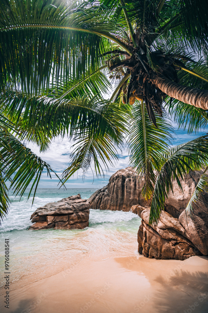 Beach with rocks and palm trees, Seychelles, Africa
