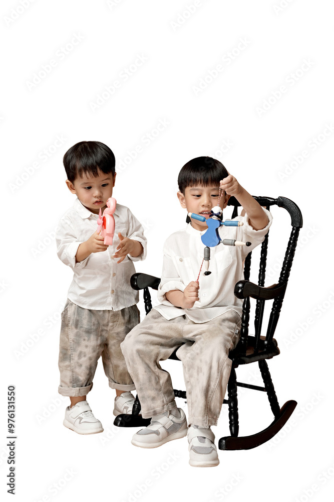 Two young Asian boys in casual attire playing with balloon animals, one standing and one sitting on a wooden rocking chair. transparent PNG white background.