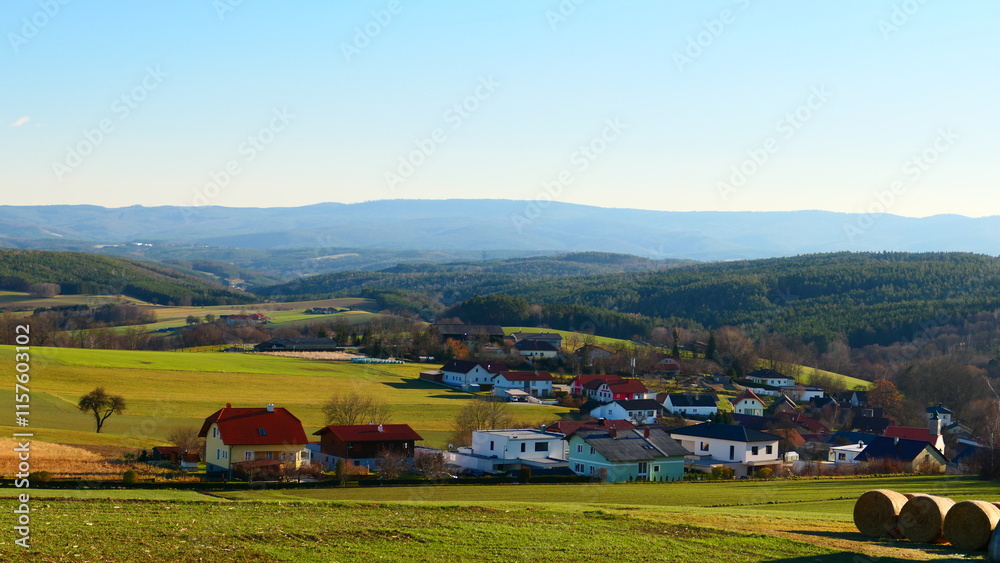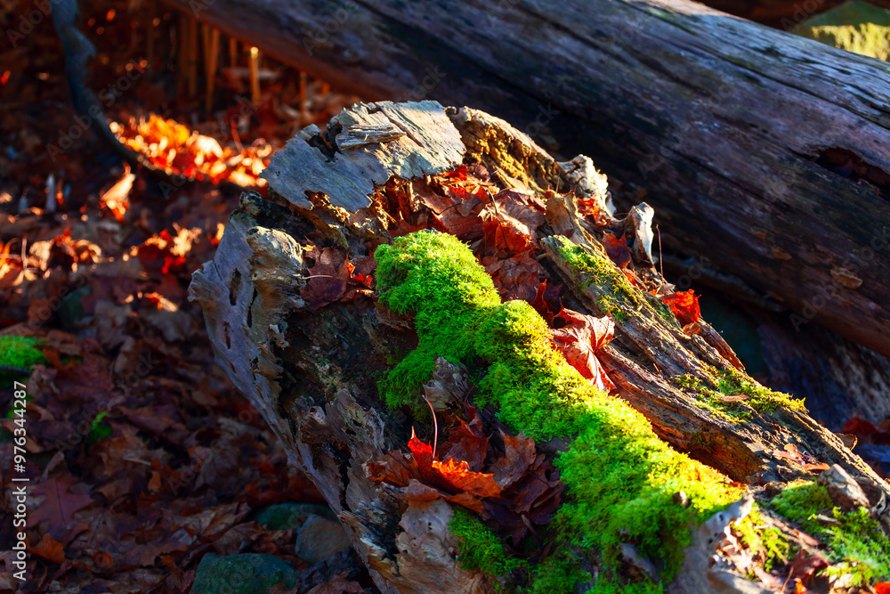 Log covered by moss and autumn leaves. Fallen tree adorned with lush moss, creating a serene and natural scene in the wood