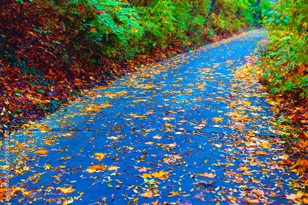 Path with autumn leaves on the ground. Serene paved road lined with lush trees and colorful leaves, creating a peaceful natural pathway
