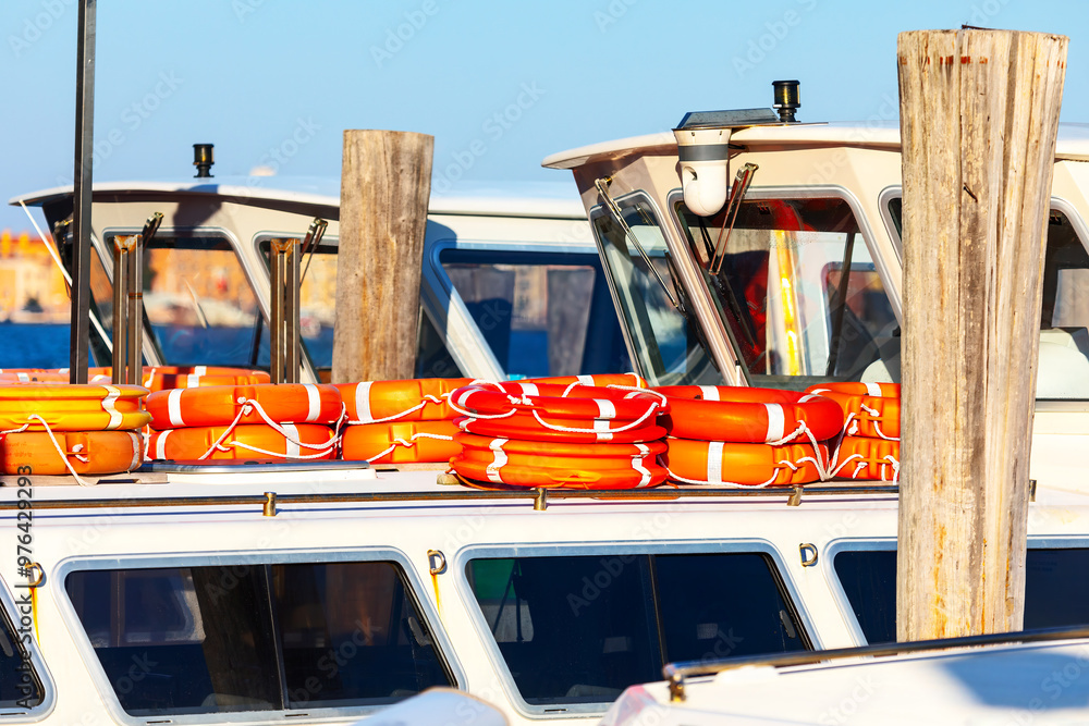 Life preservers are stacked on each other on the boat top. Boat equipped with bright life preservers, ready for safety on the water
