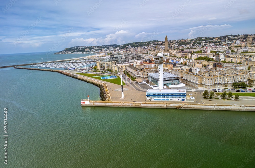 The drone aerial view of Le Havre harbour and the city, France. Le Havre is a major port city in the Seine-Maritime department in the Normandy region of northern France.