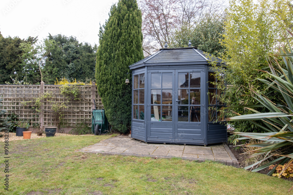 Photo of a typical British garden showing a beautiful summer house or storage shed in the UK garden