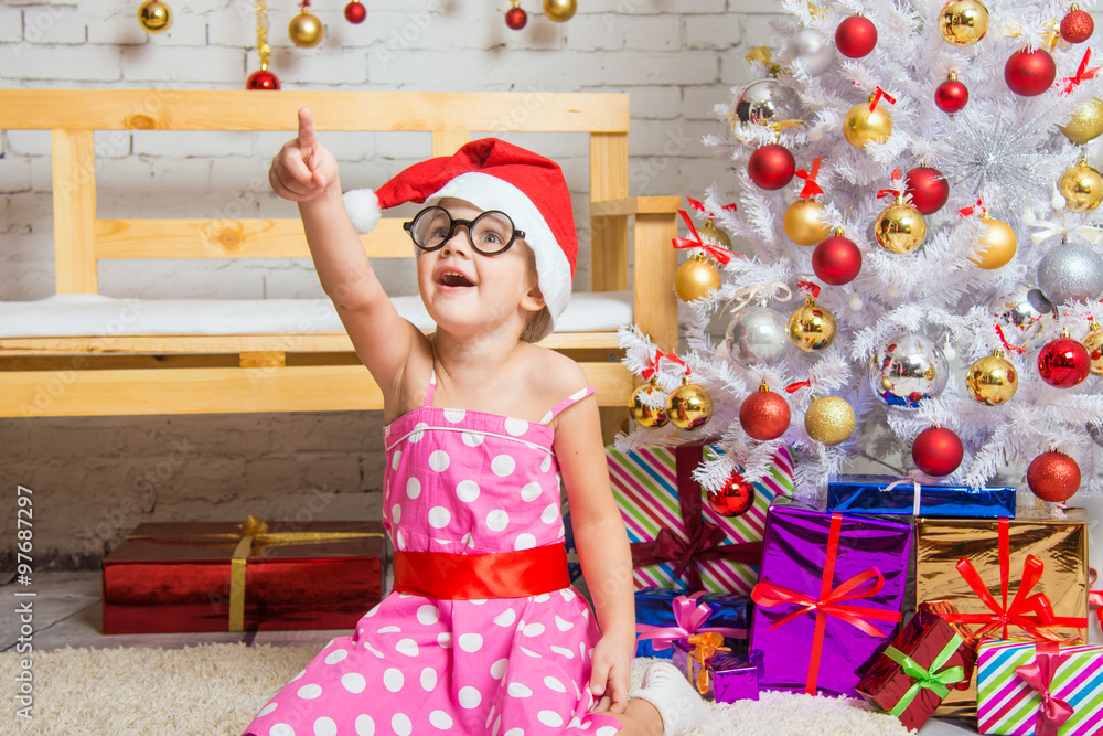 Girl in the red hat and the funny round glasses points a finger at something interesting