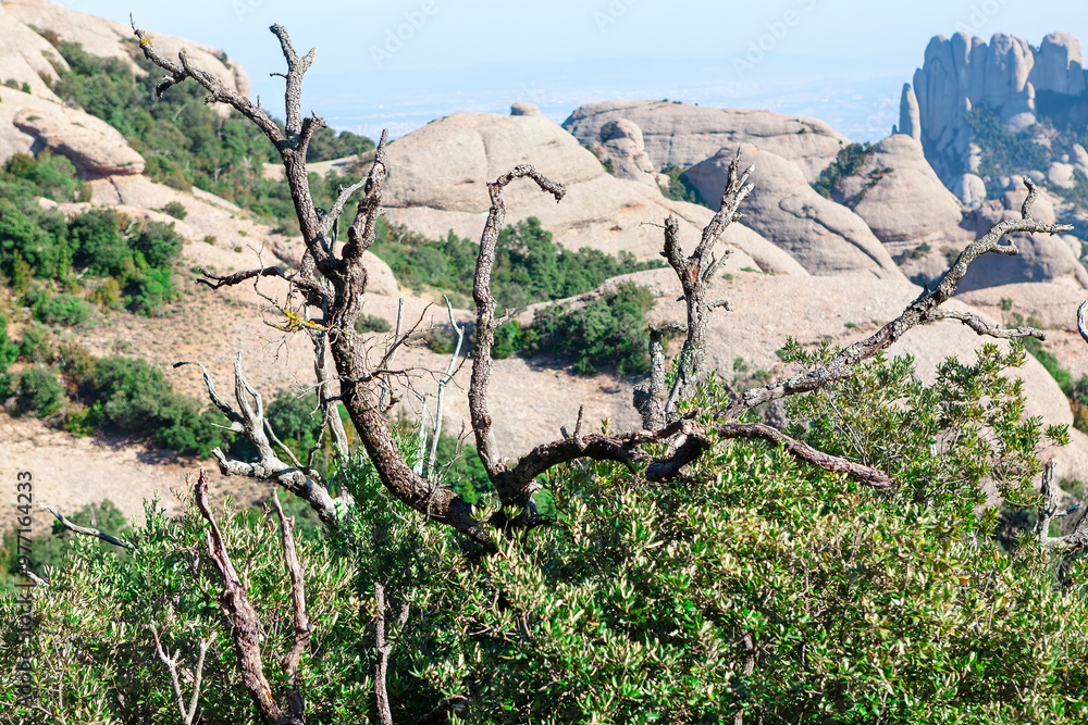 Nature of Montserrat mountains in Spain. Tree is bare and has no leaves is in the foreground of a rocky mountain