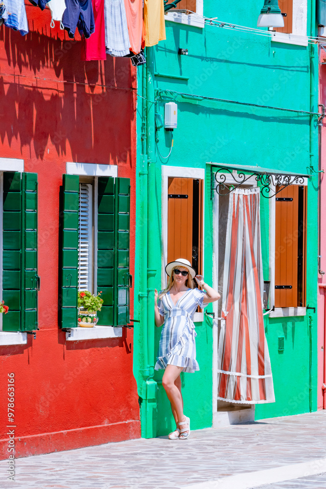 A lovely woman joyfully enjoying a sunny and warm day in Burano, surrounded by vibrant and colorful buildings