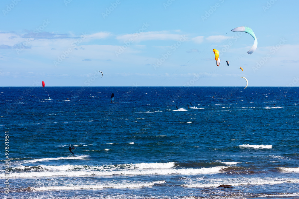 Group of people flying colorful kites, enjoying a vibrant day by the ocean