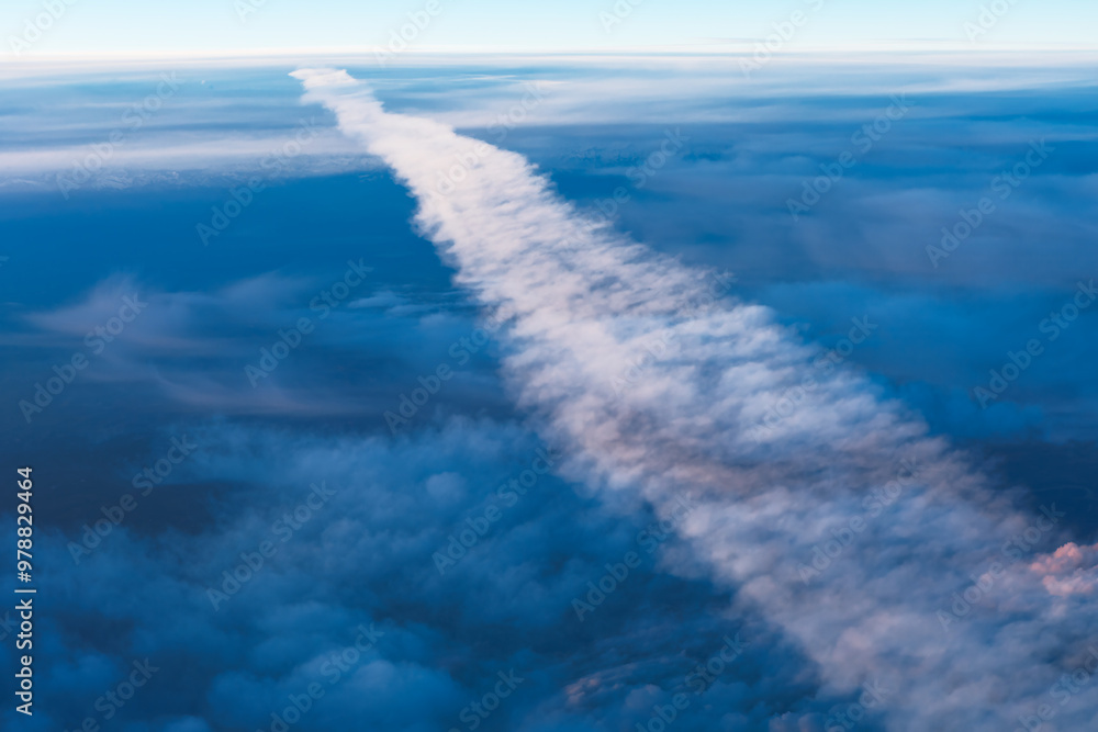 Jet trail stretches across a clear blue sky. Plane vapor trail through the clouds