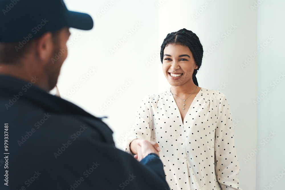 Handshake, smile for thank you and woman with courier for delivery, distribution or shipping. Business, direct or service and customer shaking hands with post office worker in home for ecommerce