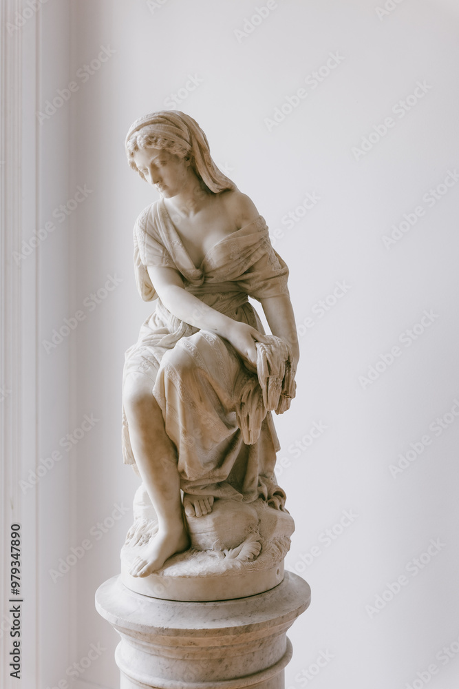 a marble stone statue of a Lady holding her dress, vintage art style with history, women under sunlight, white background
