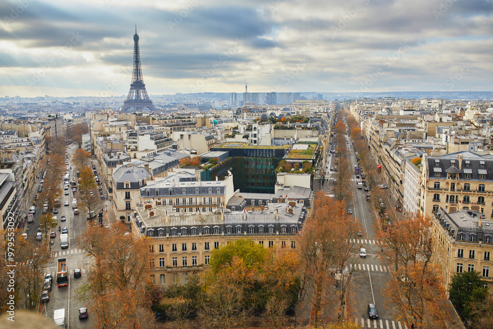 Aerial panoramic cityscape view of Paris, France with the Eiffel tower.