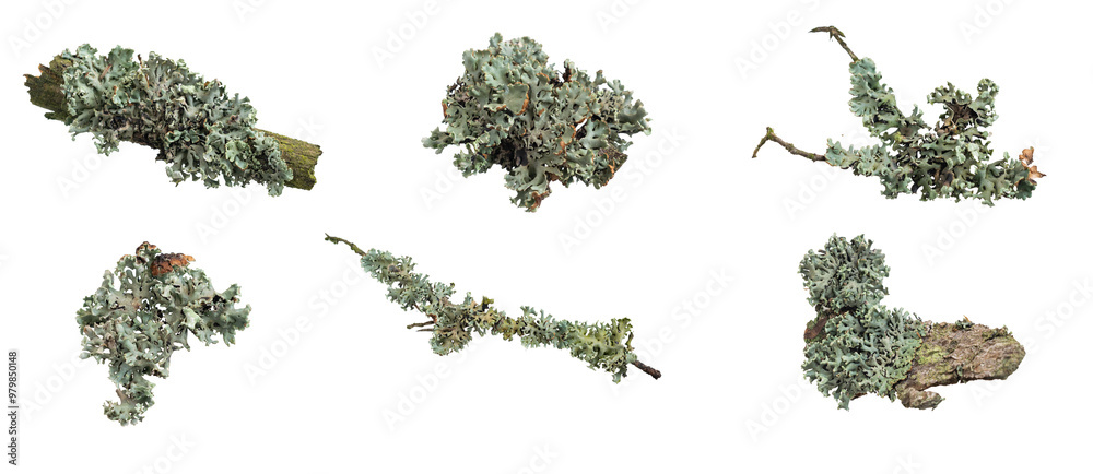 Parmelia sulcata lichen on a piece of wood on a white background