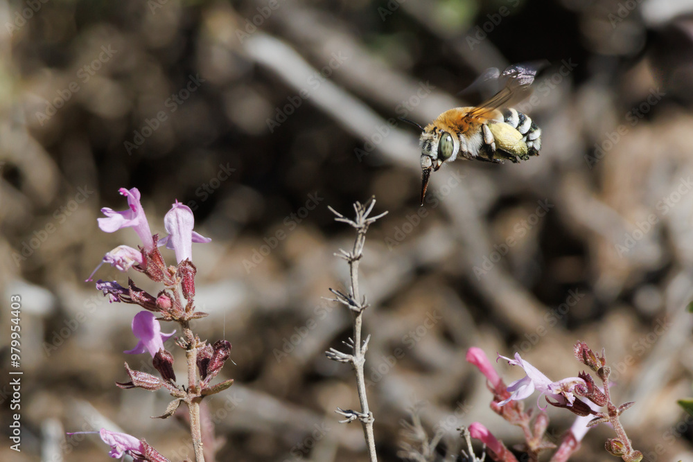 Efecto persiana enrollable de obturador electronico en alas de abeja Amegilla quadrifasciata volando, Bocairent, España