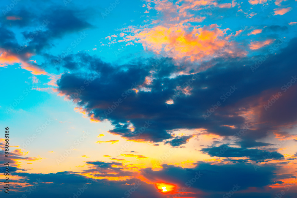 Sun is setting and the sky is turning orange. Serene sunset casts vibrant colors over the ocean, with fluffy clouds reflecting the warm hues of the sky