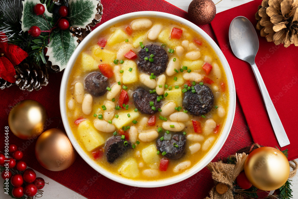 Bean stew with black pudding, peppers and potatoes. Top view table with Christmas decoration.