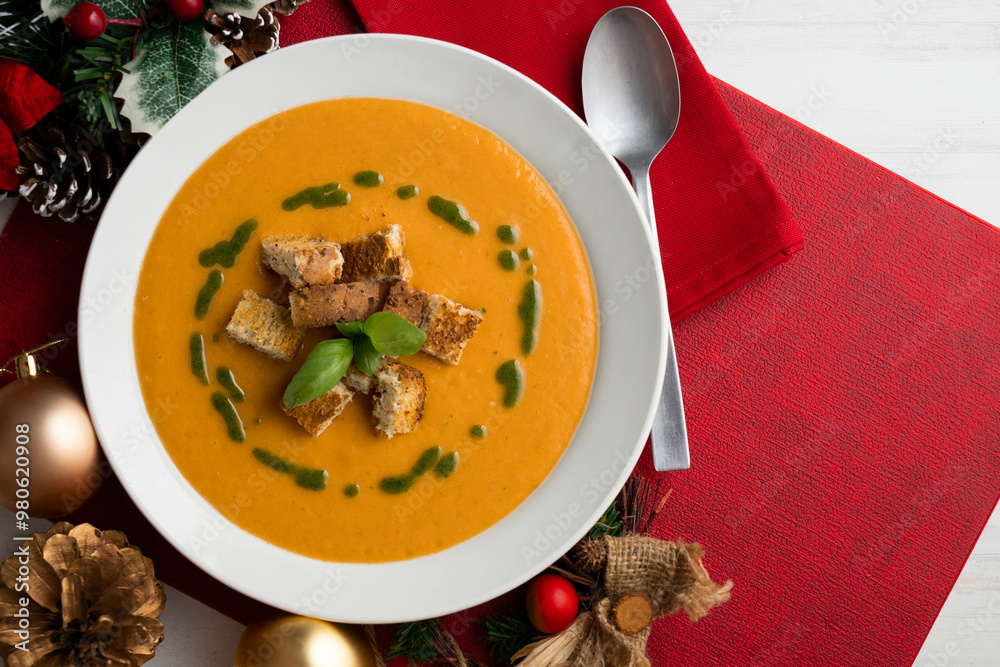 Tomato soup with basil oil and croutons. Top view table with Christmas decoration.