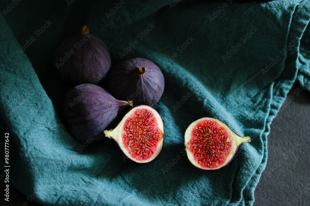 Close up of fresh ripe fig fruits in green fabric with dark shadows