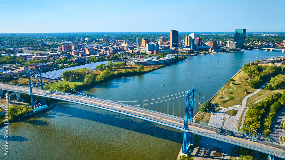 Aerial View of Blue Suspension Bridge and Toledo Skyline Over Maumee River