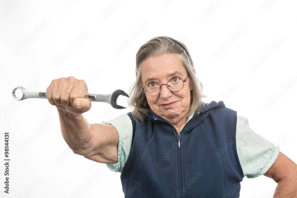 Seniorin mit Schraubenschlüssel ist entschlossen