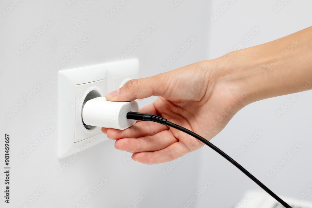 Woman inserting plug into an outlet, plugging phone charger into the socket, closeup shot