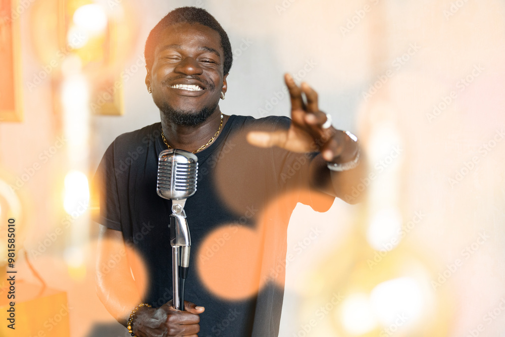 Handsome attractive african american singer, man singing in retro microphone in studio music recording