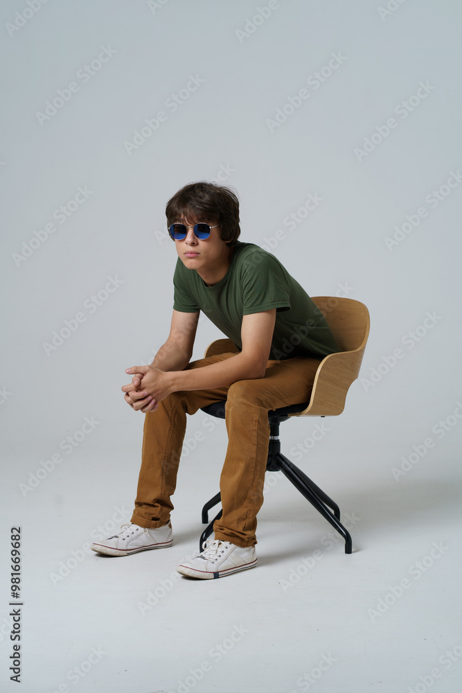 A young man in a green shirt and tan pants sits in a chair. He is wearing sunglasses and a white shirt