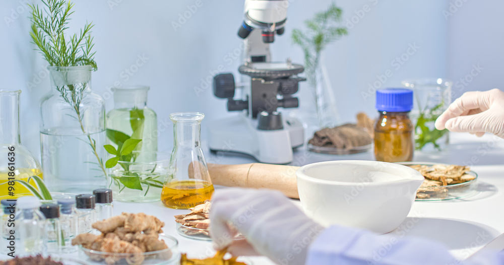 This photo of a modern lab experiment in Oriental Medicine features a scientist holding a piece of turmeric and other herbs around tablet along with professional laboratory equipment.