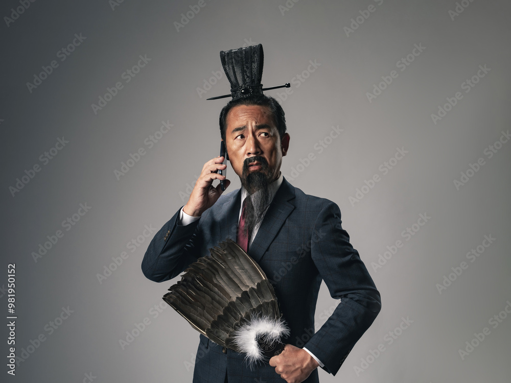 三国志に登場する諸葛孔明のような中国歴史上の軍師がビジネススーツを着てスマホで通話するシーン