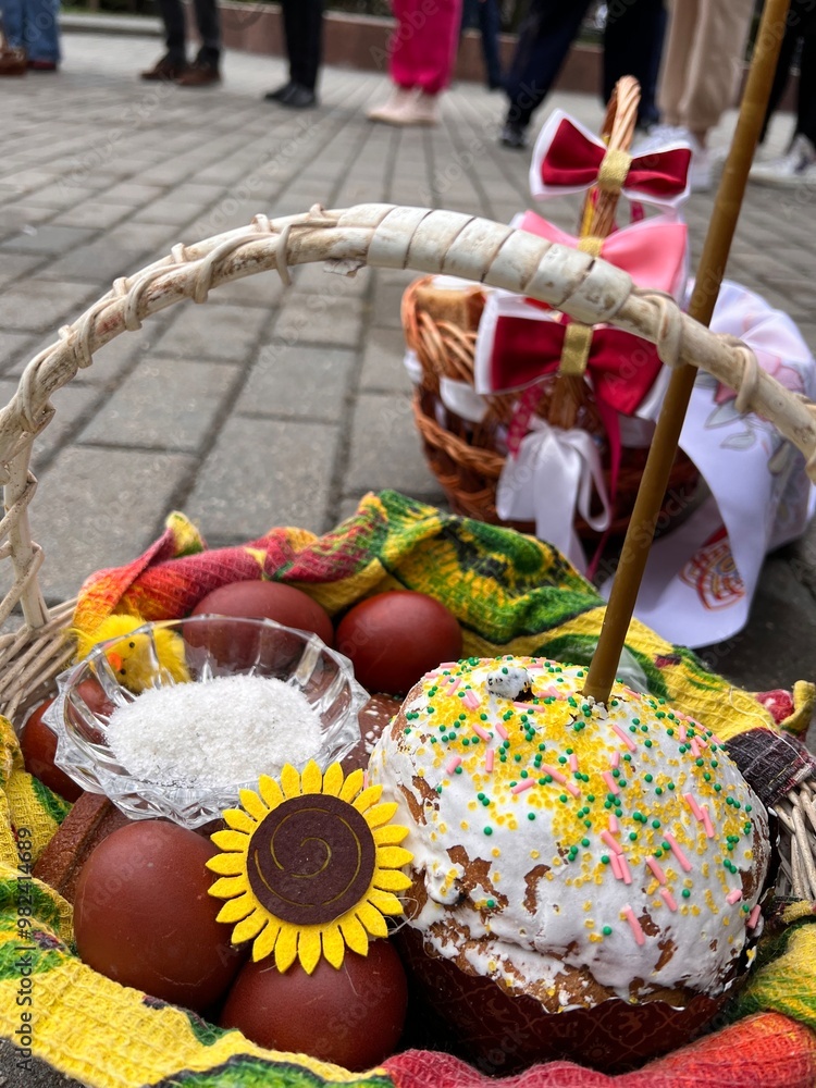 easter basket with decorated colored eggs salt bread paskha and candle for lighting in church authentic vertical lifestyle